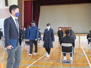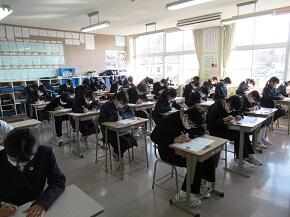 ・2年生は期末テストです。どの教室でも,緊張感いっぱいに,テスト問題に取り組んでいました。3年生は,卒業式練習を開始しました。今日は,入退場や卒業証書授与の動きについて確認しました。