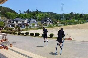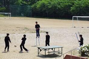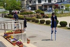 これは以前に行っていた「朝の縄跳び」の発展形の取組です。ある先生が生徒にアンケート調査したところ,運動をもっとしたいが,なかなかできていないと感じている生徒が大勢いることが分かりました。では,もし運動するとして,どの時間帯が適切かを尋ねてみると,昼休みと答える生徒が多かったのです。そこで,生徒たちに昼休みに外で運動したり,遊んだりしようと先生が提案し,生徒の一部が外に出てくるようになったのです。気候がよくなったことも一因かもしれません。何か適当な運動はないものかと先生が探したところ,新品の竹馬が倉庫にあることを見つけたらしく,5月からは昇降口に置くようにしています。