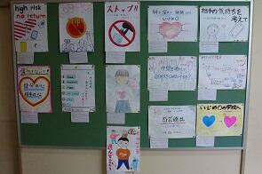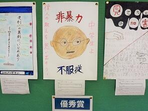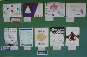 本校の独自の取組「いじめ防止ポスターコンクール」です。その作品が校内に掲示されています。今回の最優秀賞は左の写真「君はヒーローになれる」でした。3年生の作品です。そして優秀賞には「非暴力 不服従 中学生よ偉人の教えを思いだそう」などの作品でした。このポスターたちは,1年から3年まで,各学級の班ごとにポスターの構想を立て,そして制作したものです。もちろんポスターに仕上げて校内で啓発することは大事ですが,全員が「いじめ」の問題に向きあい,身近な仲間と話し合って自覚を深めることが何よりも大事だと考えています。それにしても,各班ごとによく工夫したポスターができあがりました。この取組が,実際の生活に反映できるように心がけましょう。このほかにも,先日はいじめ防止標語の作成なども行い,応募をしました。今後はCMづくりのための脚本コンテストなども行う予定になっています。期待しましょう。