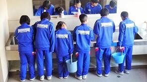 ところで右の写真は,左の写真の背景にある「手洗い場」の写真です。お気づきでしょうか。流しの下のバケツが丸見えになっていることを。昔はここに引き戸がありました。でも,当時の生徒は,この引き戸を蹴っては穴を空け,壊してしまったのです。生徒が荒れていた時代のことです。壊れた引き戸を直してもまた壊すので,遂には今のようになりました。今は校舎全体がそうなっています。「第3の荒れ」と言われた時代のお話です。今の生徒とは全然違いますが,小さなきっかけでも学校は激変してしまうことを肝に銘じておかなければなりません。2度とあの時代に逆戻りしないよう,健全育成には常に力を注いでいかなくてはなりません。そのためにも,日頃からの子どもたちとの多様な関わりが大切なのです。