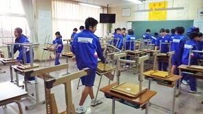 6時間目の授業を終えて,帰りの会(短学活)になる前に,毎日「清掃活動」があります。本校では生徒だけでなく,先生たちも生徒と共に清掃して,学校環境を整えています。そして,この時間は生徒との貴重なコミュニケーションの時間でもあるのです。一緒に活動しながら交流し,互いを理解し,授業とは違ったかたちで自然な言葉掛けをする場となっています。生徒数が減少しているので,生徒一人当たりの仕事量は多くなっているようですが,生徒はいつも一生懸命に清掃をしています。左の写真は清掃の反省会の風景です。なぜかいつも楽しそうに反省会をしています。思わず混じっていきたいと感じる光景です。