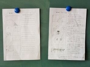 さて,どんな作品が候補になったのでしょうか?「4コマ漫画」を描きながら場面を考え,セリフをつけて脚本とし,先日は脚本選考と撮影が行われました。完成した作品は後日ご紹介したいと思います。生徒たちの感性が上手に表現されて良い作品になることを期待したいと思います。それ以上に一人一人の個性を認めて尊重し合う生徒集団が今以上に育つことを願いたいと思います。