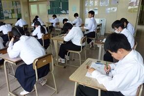 先週の今日は期末テスト1日目でした。あれから1週間が経ちました。上の写真は3年生と1年生のテスト受験風景です。下の写真はテスト直後に2年生が同級生と感想を話し合い,答えを確かめている場面です。今は答案が戻り,答え合わせも済んで,各教科の点数と合計点数が分かっているのではないでしょうか。今回の期末テストのできはどうでしたか?1年生は初めての定期テストを経験してどうでしたか?