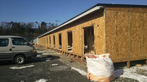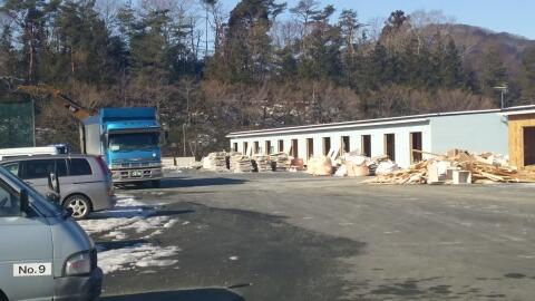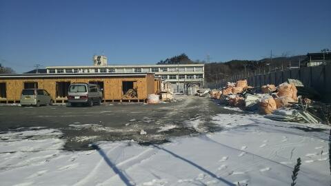 校庭にある120戸の仮設住宅の撤去作業が始まっています。校舎からでは作業の進み具合が分からないので、特別に許可をいただき、防音シートの内側で撮影させていただきました。奥の方から順に、廃棄物の分別をしながら丁寧に作業を行なっていました。