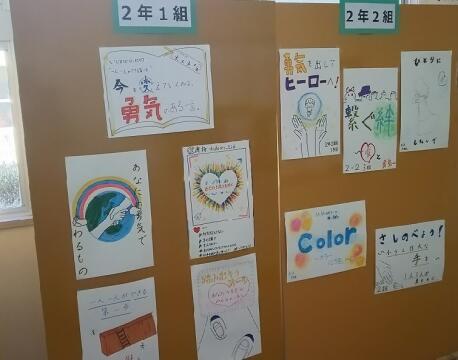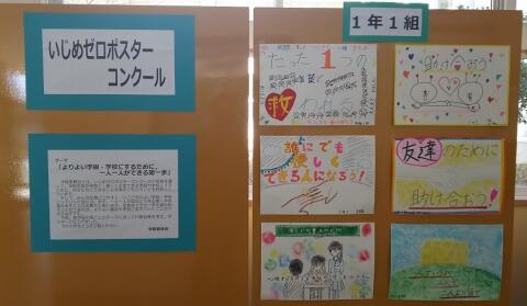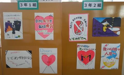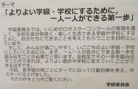 学級委員会からの提案で、『よりよい学級・学校にするために、一人一人ができる第一歩』を合い言葉に、各学級の班ごとに行動目標を考え、いじめゼロのポスター作成に取り組みました。
