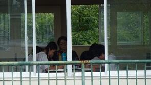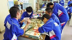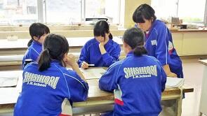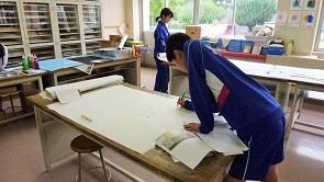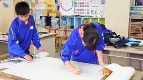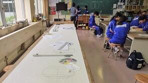 右上の女子生徒は3年生。運動会で使う学級旗のデザインを仲間と相談中です。昨年度に最優秀となった自分たちの旗の原画を参考にしながら,今年の構想を新たに練っている様子です。今年もよい作品ができるといいですね。