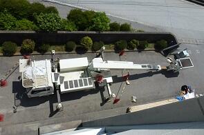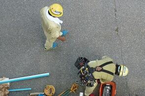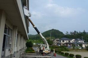 先週7月30日(火)には梅雨明けし,いよいよ夏らしい夏になりました。外の気温が35℃を上回る中,普通教室に設置するエアコンのための工事が始まりました。まずは電気の配線工事です。屋上からベランダの天井部分に配線する工事がこの暑さにも関わらず行われました。作業員の皆さんは長袖長ズボンの作業着に姿です。そしてヘルメットを着用されています。大変な作業だったと思います。月曜日から水曜日までの3日間,一生懸命に工事をしていただきました。大変ありがとうございました。今後はお盆明けの作業となるそうですが,完了するのはまだまだ先のことになりそうです。