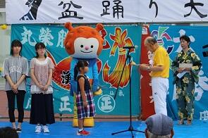 8月11日(日)には鹿折地区復興盆踊りが開催されました。震災後の鹿折地区復興を象徴する地域の行事です。開会式には市長さんを始め,大勢のご来賓の皆様がいらしていました。この行事では,中学生に「うちわ」のデザイン画が依頼されいました。今年も全校から大勢の生徒がデザイン画を提案してこの行事を盛り上げています。当日はデザイン画で最優秀賞をいただいた藤村さん,優秀賞の及川さん,特別賞の菅原さんの3年生3名が表彰を受けました。おめでとうございます。素晴らしい作品でした。