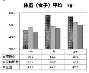 (健康課題①:肥満)3年生男子を除いて,本校生徒は肥満傾向にある。特に,2・3年生女子は深刻な状態。