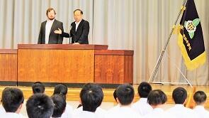 8月26日(月),2学期が始まりました。爽やかに澄んだ空気と日差しの下,2学期の始業式が行われました。式に先立って,新しく着任されたALTのジェイコブ・サイズ先生が生徒に紹介されました。ジェイコブ先生はアメリカのノースカロライナ州出身で,この7月に来日し,本校を始め市内の小中学校で勤務されます。以前には日本の大学に留学していたこともあるそうです。自己紹介では「わんちゃんが好き」と話されていました。とても日本語が上手です。これからよろしくご指導をお願いいたします。
