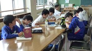 左下の生徒は,学級に掲示するみんなの目標の清書を担当し,黙々と取り組んでいました。自分から学級に貢献しようとして頑張っていました。右下の男子生徒たちは1学期に取り組んだ美術科のデザイン作品の仕上げです。どうやら仕上げが夏休みの課題となっているようです。良い作品になるよう最後の仕上げを頑張ってくださいね。