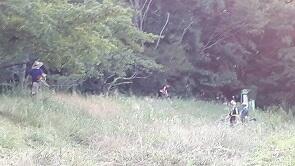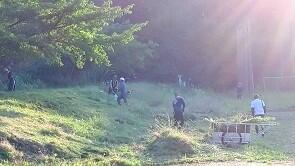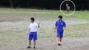 もちろん,放課後にも長縄跳びやムカデなどの種目の練習を生徒たちは重ねてきました。そして,除草作業にも進んで取り組んでいます。練習風景を見学に来たのか,いつものお客様(鹿)が現れました(右下の写真の〇印)が,生徒たちはいつものことで驚きもせず,何食わぬ顔で無視をして練習を続けていました。やがて,鹿はフェンスの向こう側の森に帰っていきました。生徒が相手にしてくれないので,がっかりしたのでしょう。