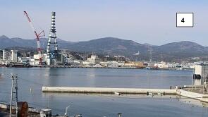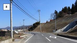 ⑦は,大きなクレーンが見えます。造船所があるところの写真です。ここはまだ新しい道路が開通していないので,ヘアピンカーブで従来の道に接続しなければなりません。そして,⑧の写真の向こうには浪板橋があります。橋の付け根には信号機があり,道路は上り坂です。自転車で通るときは結構危険ではないでしょうか。
