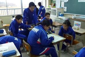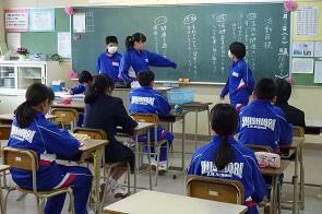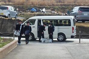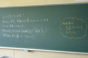 左上の写真はスクールバスで生徒が学校に到着した時の様子です。小学生も乗ってきます。中学校で生徒が下車した後,小学校まで行くのです。浦島地区は災害で通学路が未整備のため,スクールバスが配車されています。今年はバスを利用する児童生徒が少し増えたと生徒は話していました。運転手さんとの仲もよいそうです。早く道路がよくなるといいですね。左上の写真,教室に行くと担任の先生からのメッセージや連絡事項が黒板に書かれています。直接話すだけでなく,こんなかたちでコミュニケーションしたり,指導したりすることもいいですね。