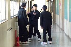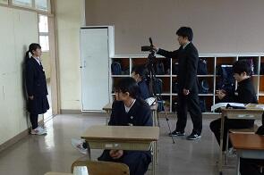 左下の写真,朝の会が始まる前には,教室の前で生徒同士が談笑しています。どんな話をしているのでしょうか。それぞれのクラスの様子を話題にしたりしていると思います。右下の写真,授業の合間には写真撮影です。これは生徒名簿などに使うものですが,昨年度の卒業生を送る会では3年分の写真の変化をスライドで紹介されて生徒の歓声が上がっていました。新年度のスタートの様子でした。