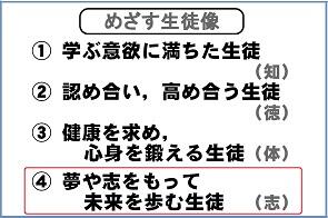 また,目指す生徒像には4番目を新設しました。「④夢や希望をもって未来を歩む生徒」です。何度かご紹介したとおり,本校の生徒の4割は震災で転居を経験している子どもたちです。どちらかと言えば,自己肯定感が低く,夢や希望が乏しく,社会参加への意欲が低い傾向があります。震災との関連は分かりませんが,前向きな態度で希望をもって自分の人生を豊かに開拓する人間になってほしいのです。そんな願いから「志」の分野からの目標を決めました。せっかく養った「知・徳・体」の資質能力を,前向きに生きる「志」を持つことで,積極的に活用し,自他の幸せを求めて生きてほしいと願うからです。