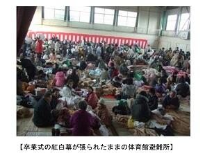 8年前の震災時には,生徒の家庭の6割が家屋の被害を受け,その後,仮設住宅や親戚宅などに身を寄せることになりました。学校は4月下旬まで再開することができず,ようやく始まった新年度も,今とは違った臨時的なもので,制服や学用品も揃わないままのスタートとなった訳です。本校は写真のように体育館が避難所となりました。生徒たちはそんな中でも避難所の手伝いなどを一生懸命に行って,逆境を乗り越えようと努力し,頑張ってきました。