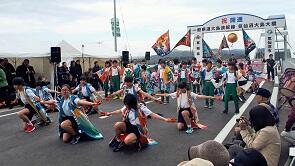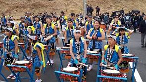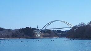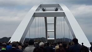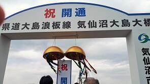 開通式では大島小・中学校の児童生徒たちが「島中ソーラン」をお祝いに披露していました。橋の向こうでは鹿折地区伝統の「浪板虎舞」が演奏をしてくれました。鹿折小・中学校の児童生徒もたくさん参加しての演奏です。「浪板虎舞」のみなさんは,いつも地域の行事の際に素晴らしい演奏をしてくれています。今回は,大島から歩いて橋を渡ってきた 大勢の人々を華やかにお迎えしてくれました。今日も頑張ってくれてありがとう。写真は当日の開通式の様子です。美しいアーチの橋です。そして,美しい故郷:気仙沼です。