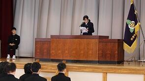 披露式の後には,早速,始業式です。校長先生の式辞では,鹿折中の先輩たちが「笑顔とあいさつ」を大事にして震災を乗り越えてきたことが紹介されました。これを今後も大事にしながら,多くの支援に報いる学校生活を生徒が中心となって創造し,発信していこうと話されました。また,各学年代表として,2年生の小山さんと3年生の内海君が,今年度の決意と抱負をしっかりと述べました。新たな1年に対して,これまでの経験からチャレンジすること,将来を見据えた上で努力することなどが述べられました。(下の写真)3年生のリーダーシップの下,2年生も牽引力となって,新1年生をリードし,生徒が一丸となった学校生活をしてほしいと思います。