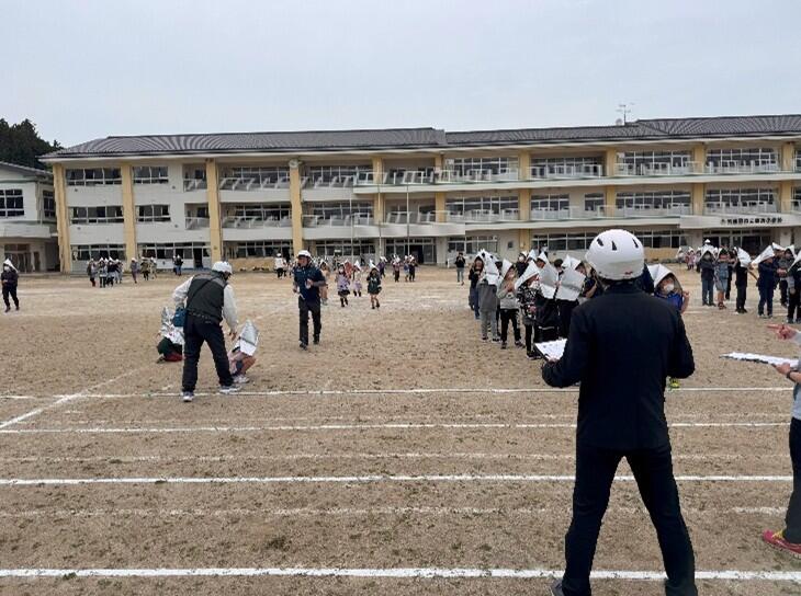 本日、火災時の避難訓練を行いました。古町出張所から署員の方に来ていただき、避難の仕方についてご指導いただきました。今回は理科室から出火したことを想定し、火元から遠ざかるように避難経路を通りながら避難しました。子供たちは防災頭巾をかぶり、素早く落ち着いて避難することができました。