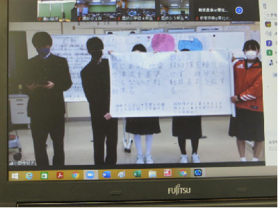 今年度は,海と生きるとは何か,海洋教育(本校では「海と生きる探究活動」)で学んだことをもとに作成した「旗」を用いての発表でした。