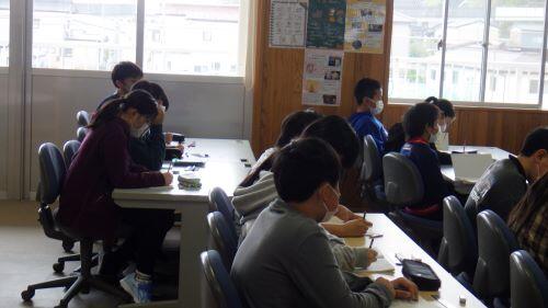 本日、3校時目に鹿折金山資料館館長豊田康裕さんと熊谷和裕さんをお招きして、ワカメについての講話をいただきました。ワカメの種ばさみを見せていただいたり、現在のワカメ養殖の苦労について話していただいたりしました。
