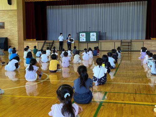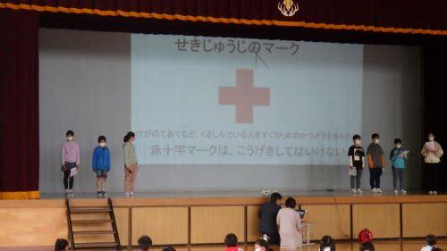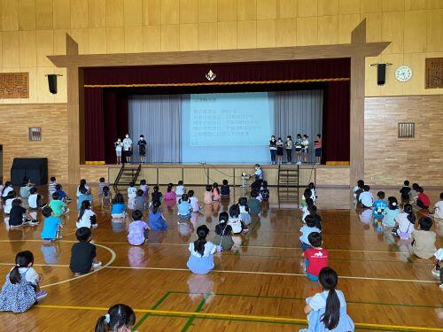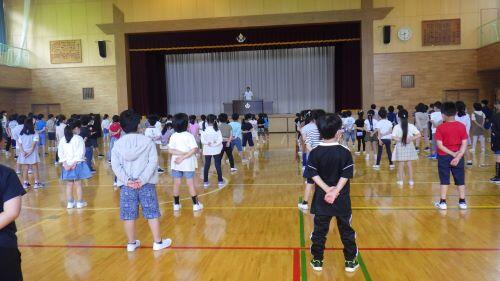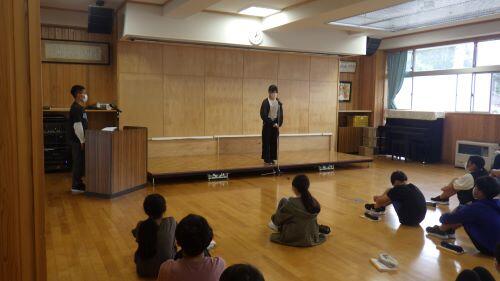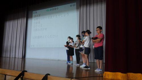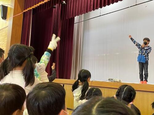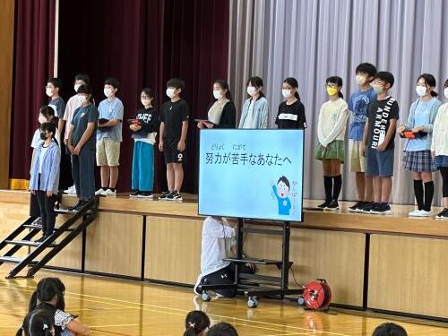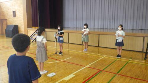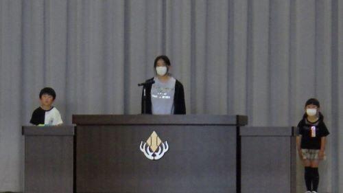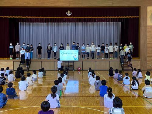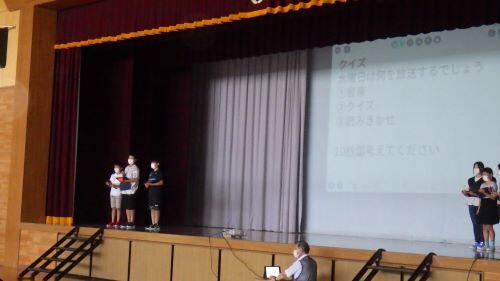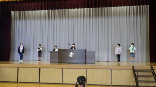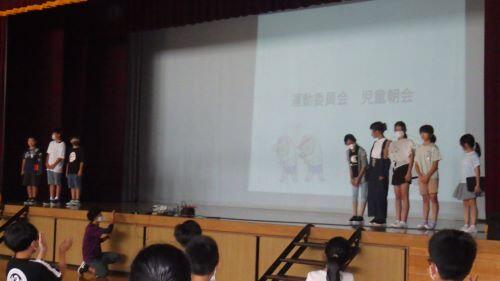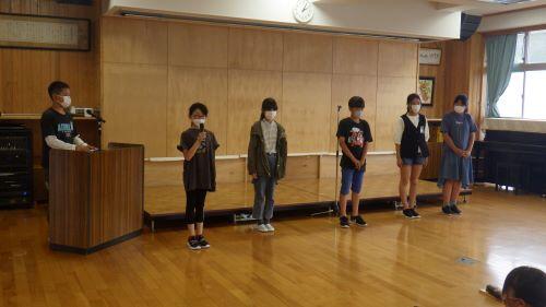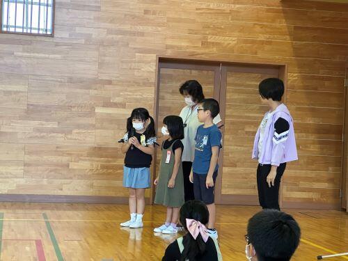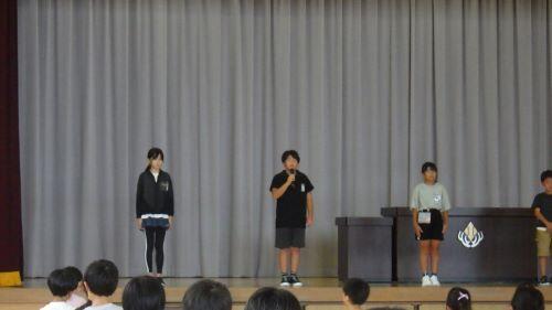 児童朝会では、図書委員会からクイズ形式で本の紹介や分類番号の説明を行いました。とても分かりやすく、そして楽しく図書のことが分かりました。読書の秋です。たくさん本を読み、心の栄養をたくわえましょう。