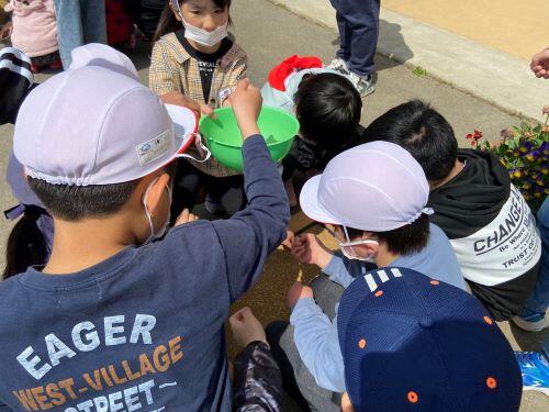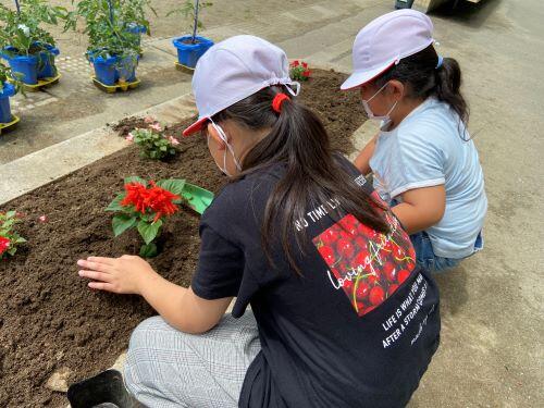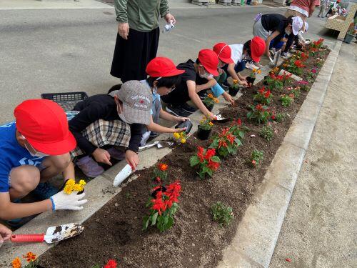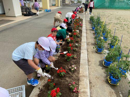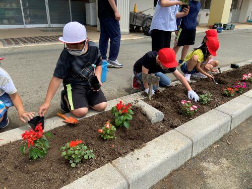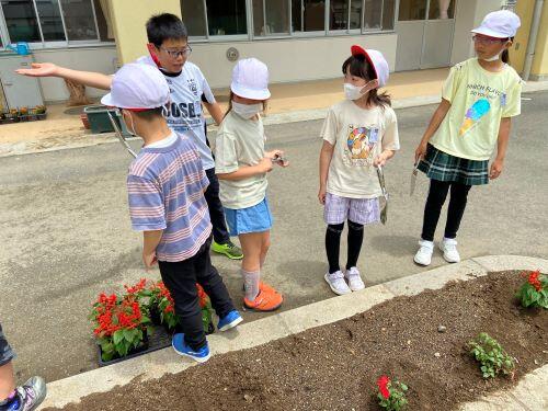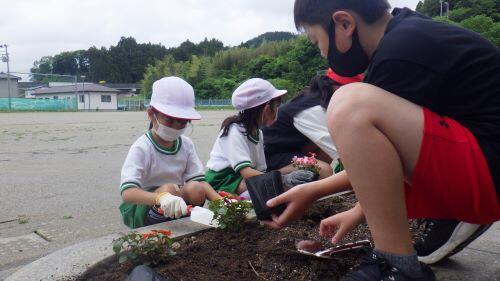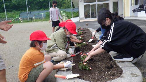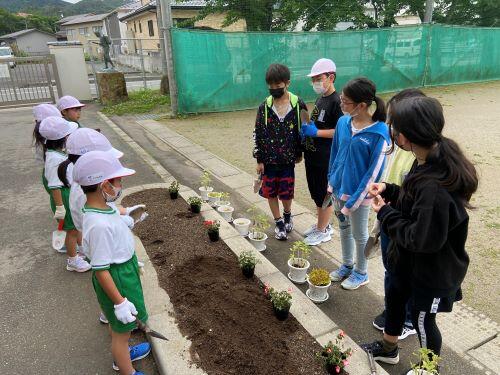 今日は、全校で春に向けて花壇にパンジーの苗を植えました。1年生は6年生に2年生は5年生に教えてもらいながら、そして3年生と4年生は協力して植えました。