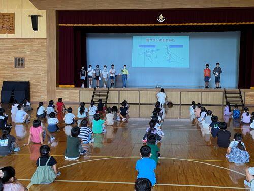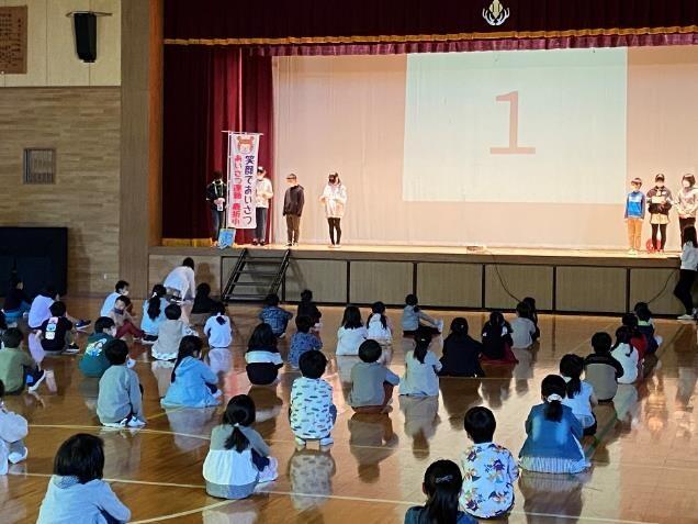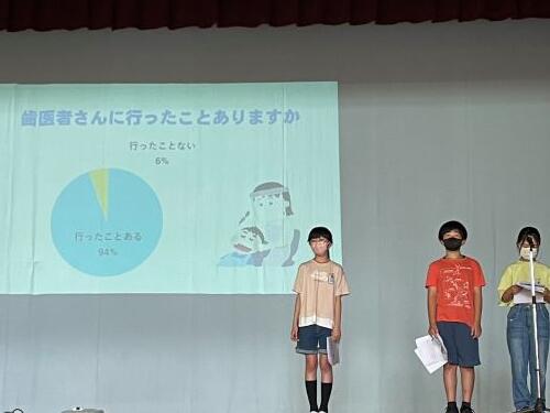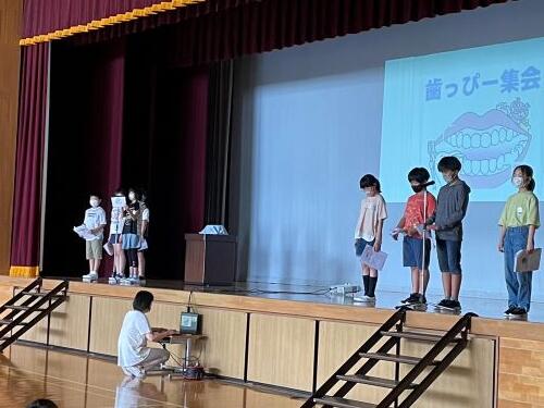 業前時間に保健委員会による児童朝会「歯っぴー集会」を行いました。子供たちのアンケート結果を分かりやすくまとめ,歯を丁寧に磨くことの大切さを伝えました。また,歯の模型を使って,正しい歯の磨き方を紹介しました。