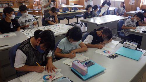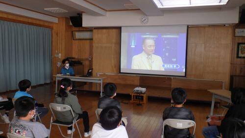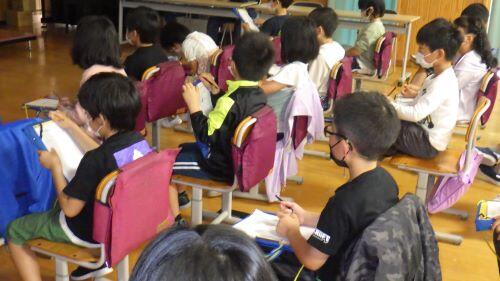 本日午後に、オンラインによる「海洋教育こどもサミット」があり、本校の5、6年生が参加しました。代表児童による「海と生きる探究活動」の発表の他に、他校の発表を聞き、疑問に思ったことを質問したり、感想を述べたりしました。発表を聞いた後には、「『海と生きる』未来の実現のためにできることは何か」を考え、オンラインでの学びを深めていました。