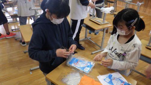 各クラスに中学生が入り,一緒に遊んでもらったり,丸を付けてもらったりしました。