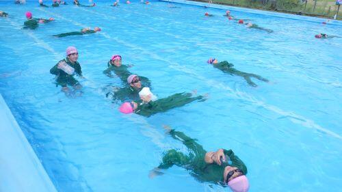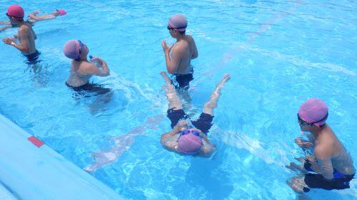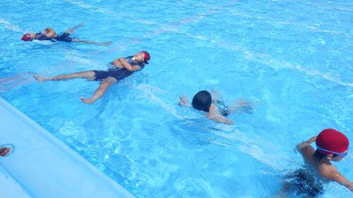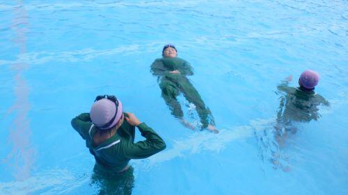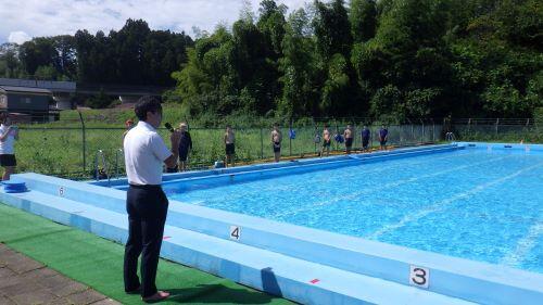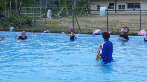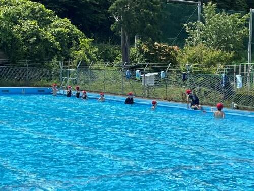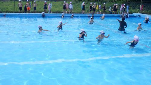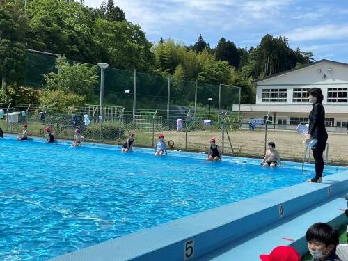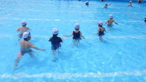 初めてのプールはとても気持ちがよく,元気のよい声がプールに響いていました。たくさん練習をして,少しずつ潜ったり泳いだりできるようになってください。