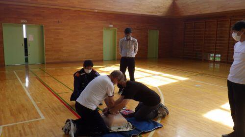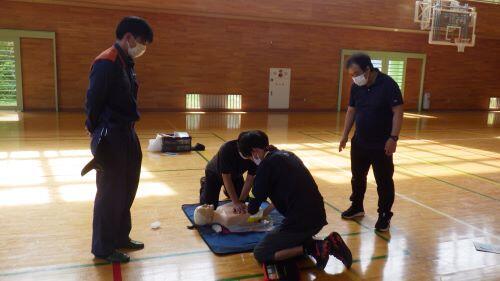 また,放課後には,教職員が救命救急講習を受講しました。心肺蘇生法やAEDの使い方などを消防署の方から教えていただきました。万が一に備え,しっかりと学んでいました。