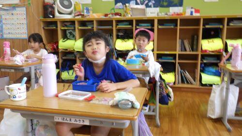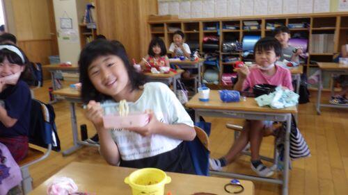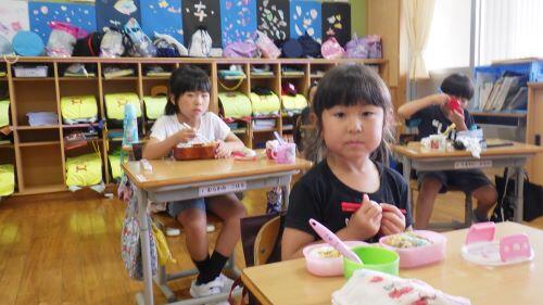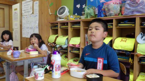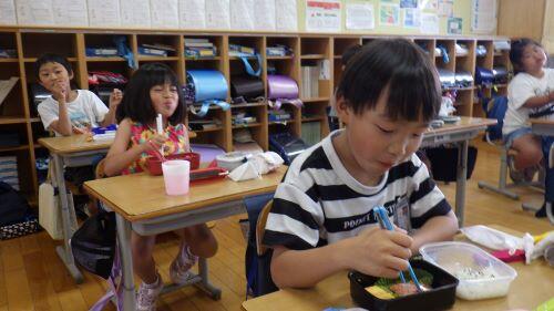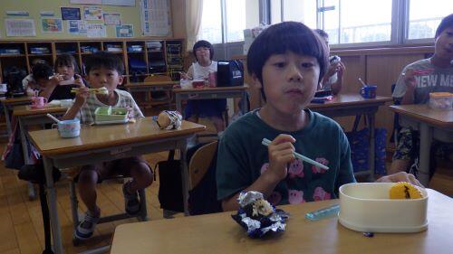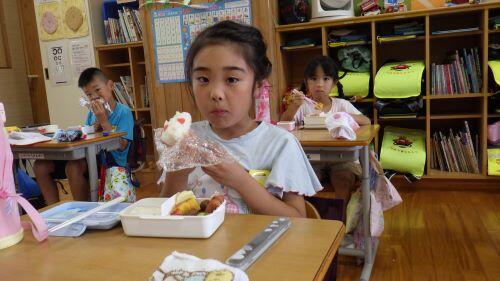 今日は,3年生以上が子ども芸術劇場のため,全校お弁当の日となりました。1,2年生は先日の校外学習でお弁当を食べましたが,教室で食べるお弁当はいつもの給食と違って楽しかったようでした。