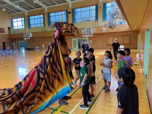本日、1~3校時、3,4年生がキリバス共和国ワーメモリアル小学校と交流会を行いました。3年生では「自分の国・地域の伝統を大切にしよう」をテーマにそれぞれの国の伝統文化について紹介し合いました。鹿折小からはこれまで調べてきた浪板虎舞について紹介しました。キリバスからは伝統的な踊りを紹介してもらいました。これからもそれぞれの伝統行事や踊りを受け継いでいきたいと話していました。