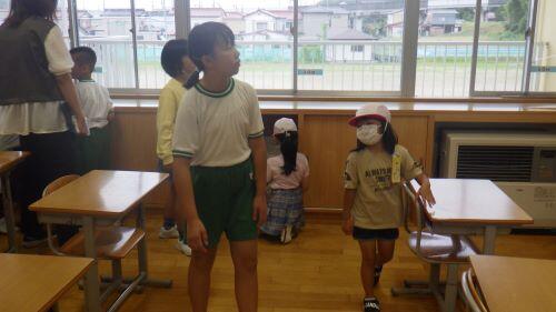 煙の中で歩く煙中歩行は、2、4、6年生の児童が体験しました。消防署の方から口をおおい、体を低くして歩くことを教えてもらい、教室の中を歩きました。