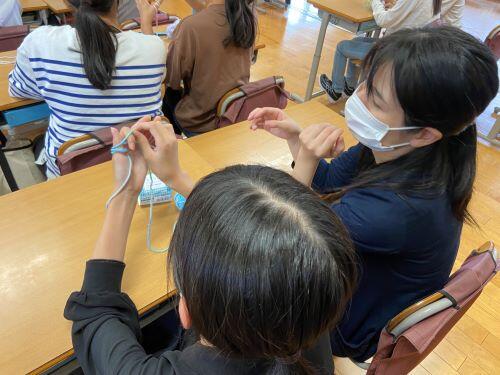 ロープワークでは,グループ毎に様々な結び方を教えてもらい,最後には全員で一つのロープになるように結びました。