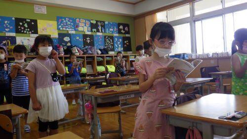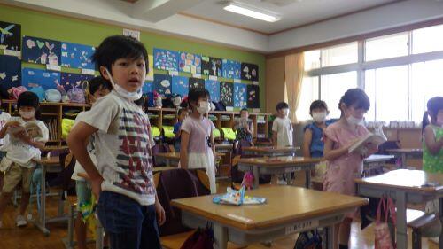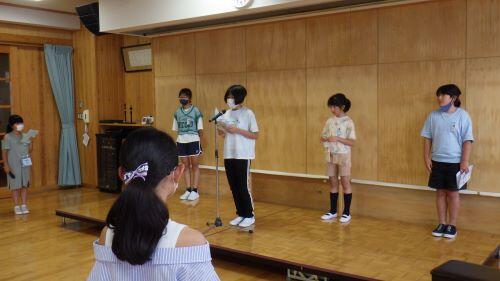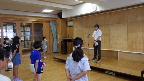 終業式では、校長先生から「100日間の1学期よく頑張りました。2学期もめあてに向かって頑張りましょう」とのお話や、代表児童の1年生小野寺凛さん、3年生小山友護さんから1学期に頑張ったことの発表がありました。2人とも原稿を見ずに暗記して堂々と発表していました。