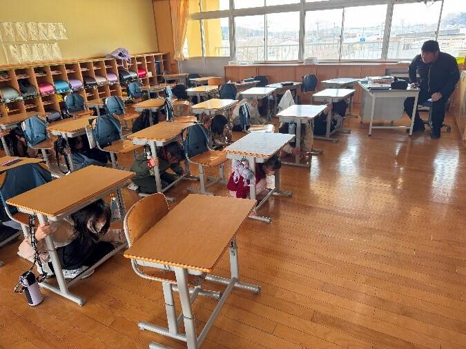 今日の学習中、ちょうど地震が起こりました。子供たちは直ちに机の下に身を隠すことができました。これまでの学習がしっかりと身に付いている様子がうかがえます。