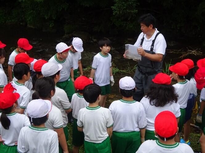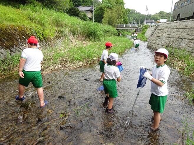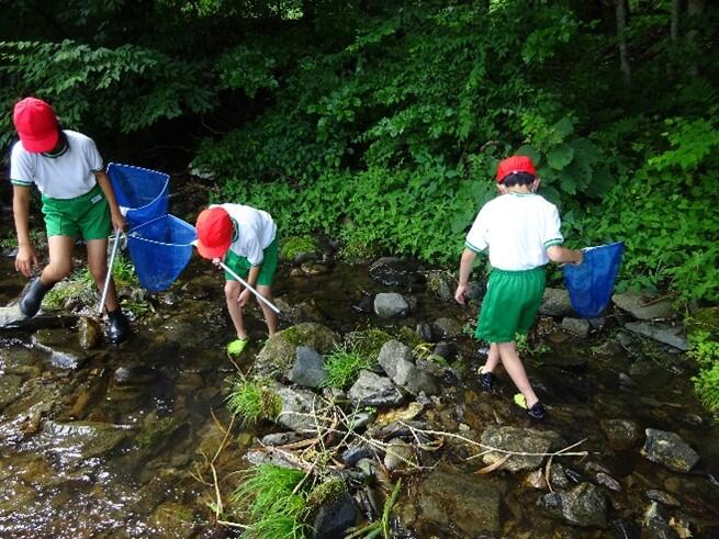 子供たちはグループに分かれ、自分たちが予想を立てた生き物を一生懸命探しました。モクズガニやヘビトンボの幼虫、カワゲラ、エビ、イモリ、ヤマメなど、予想以上に多くの種類の生き物を見付けることができました。また、見付けた生き物から、海とのつながりや川の豊かさにも気付くことができました。