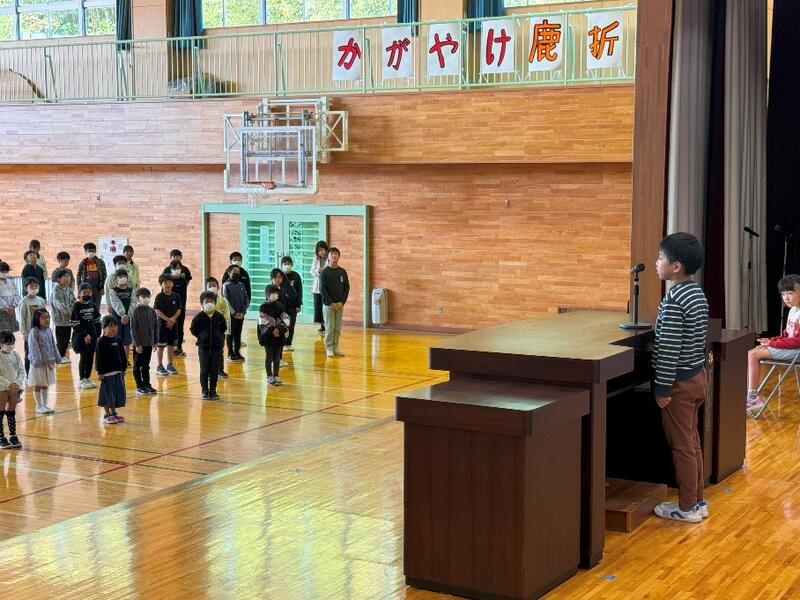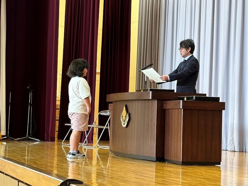 終業式の中で校長先生からは、年度の初めから学校全体の目標としている「思いやりの気持ち」についてお話しがありました。また、児童を代表して、1年生の伊藤陽菜さん、3年生の伊藤咲人さんが1学期を振り返って頑張ったことや2学期の目標を発表しました。2人の発表を聞き、他の児童も1学期の取組について学級で振り返りを行いました。