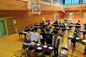 今年度は,海と生きるとは何か,海洋教育(本校では「海と生きる探究活動」)で学んだことをもとに作成した「旗」を用いての発表でした。