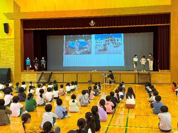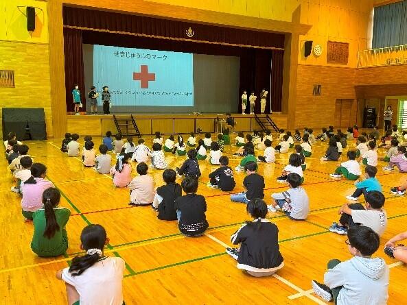 本日業前の時間に、ユネスコJRC委員会の児童朝会を行いました。今年度から名前が変わり、世界的な視野をもって活動できるようJRCの前にユネスコが付きました。JRCは青少年赤十字の意味で、募金活動の呼び掛けやありがとうカードの紹介などを活動として行っています。朝会では、募金によって困っている海外の人たちにどのようなことができるかなどのクイズを交えて紹介をしていました。最後に全員で誓いの言葉を述べました。一年生も晴れて青少年赤十字の一員となりました。