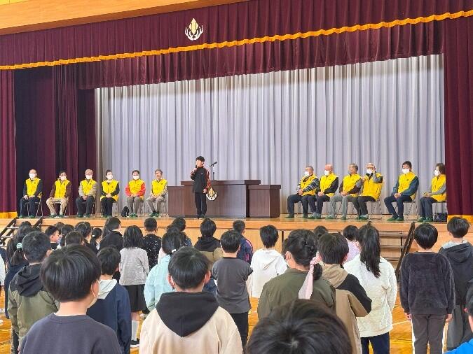 本日業前時間に、鹿折子ども見守り隊の方々の紹介の会を行いました。子供たちの登下校時に、安全に歩行できるかを見守ってくださいます。6年生の大江大毅さんの声に合わせ、全校でよろしくお願いしますの挨拶をしました。