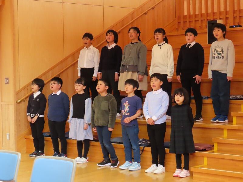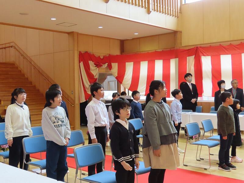 校歌斉唱。子供たちの声が気持ちよく会場に響きました。新しい学年に向けての意欲を感じました。