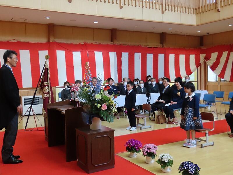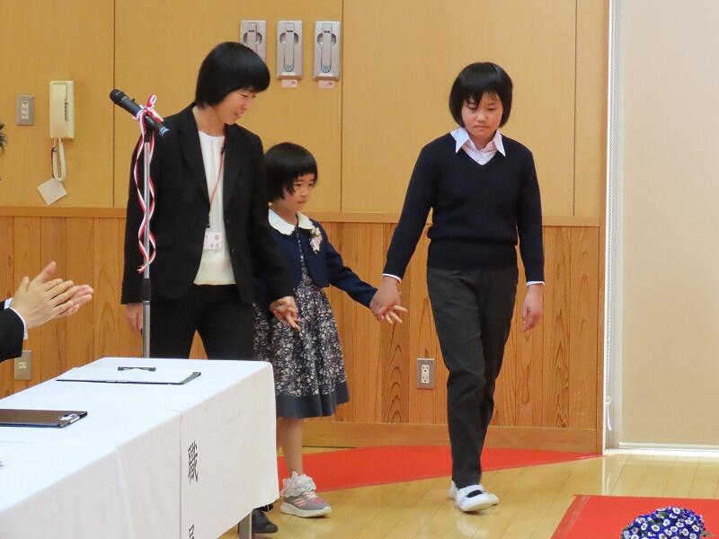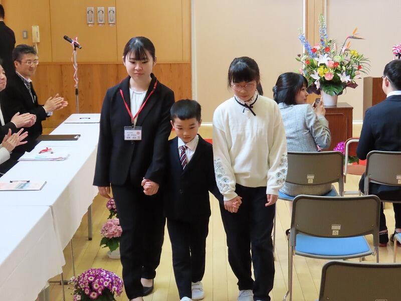 引き続き、入学式です。2人の新入生をお迎えしました。2人とも緊張した面持ちで、6年生児童にエスコートされながら入場しました。