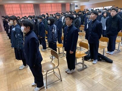 集会では、創造的自律的に活動や探究ができるようになってきたこと、協力して進めるようになったこと、目標の立て方などを話しました。また、生徒指導部から冬休みの過ごし方、SNSの使い方、安全な生活について話がありました。