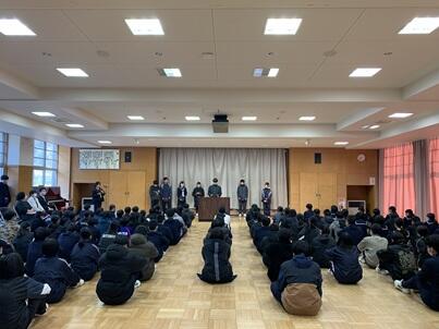 学級での朝の会終了後、多目的室で、生徒集会を行いました。
