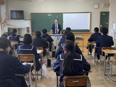 1月23日(金曜日)、3年生の技術の時間に、広島県の技術、家庭の教材を製作している久富電機産業株式会社 代表取締役社長の小林俊夫様をお迎えして、日本を取り巻く世界の情報の国際情勢についての講話と双方向のプログラミングを学びました。