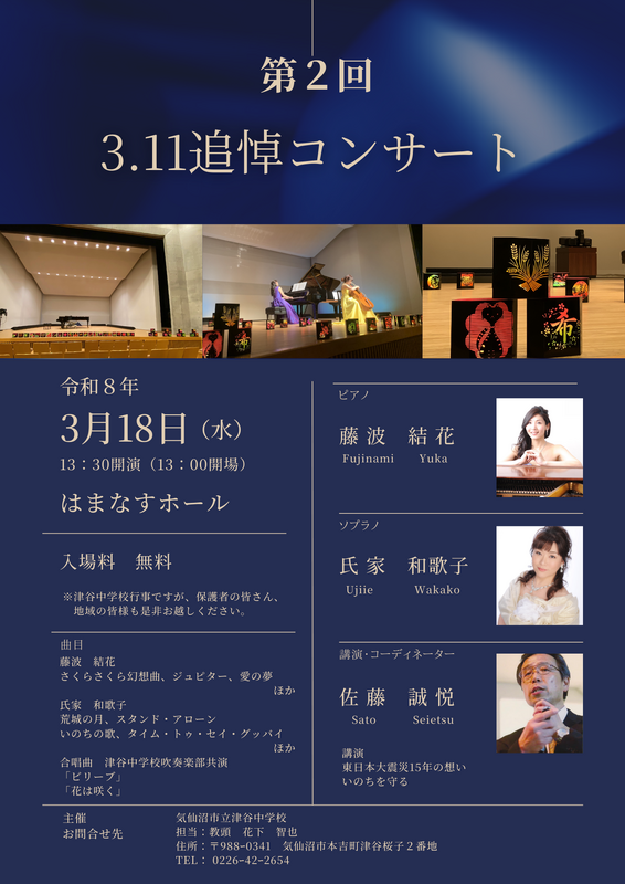 3月18日(水)13:30から(開場13:00)はまなすホールにおいて、3.11追悼コンサートを開催します。第2回目の今回はピアノ奏者、藤波結花様、ソプラノ歌手、氏家和歌子様をお迎えします。また、コーディネーターをしていただいた佐藤誠悦様の講演もあります。今年は津谷中生徒、保護者だけではなく、地域の皆さんにもお越しいただきたいと思います。ぜひお越しください。